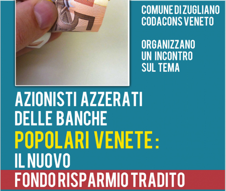 Azionisti azzerati delle banche popolari venete“: questo il tema dell’incontro pubblico organizzato dal Comune di Zugliano in collaborazione con l’associazione dei consumatori Codacons Veneto che si terrà Giovedì 15/02/18, alle ore 20.30, presso la Sala Pubbliche riunioni di Zugliano (sotto la Scuola Primaria Fabris). Il tema è quello del risparmio tradito e dell’azzeramento di valore delle azioni delle due ex banche popolari venete, vicenda che ha purtroppo interessato molti risparmiatori del nostro territorio.