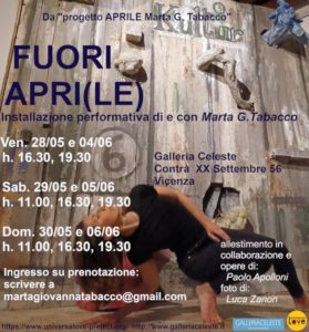 Il risultato è l’installazione performativa, presentata in anteprima il 28,29,30 maggio alla Galleria Celeste, contra’ XX Settembre, 56 Vicenza che si ripeterà nei prossimi giorni, il 4,5,6 giugno.