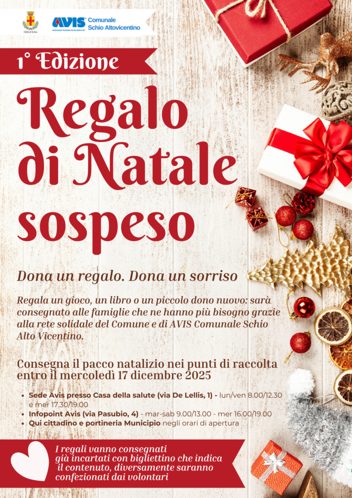 Dopo il caffè sospeso di classica tradizione napoletana e il libro sospeso, iniziativa di solidarietà culturale che da diversi anni tocca diverse realtà in Italia, arriva anche il dono sospeso: il progetto è promosso in vista del Natale dal Comune di Schio, in collaborazione con AVIS Comunale Schio Altovicentino, ed è pensato regalare un po’ di atmosfera festosa alle famiglie che vivono situazioni di fragilità economica e sociale.