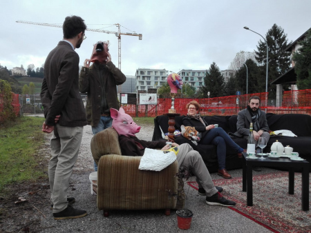 Questa mattina – riporta in una nota del 24 novembre l’associazione Vicenza si solleva con l’iniziativa “Ambientalisti da salotto” – abbiamo portato divani, tappeti e soprammobili all’ingresso del cantiere del lotto E di Borgo Berga allestendo un vero e proprio salotto di fronte agli scheletri di cemento armato dell’Eco-mostro. La parte bella e curata del complesso, quella con gli alberelli e i bar chic viene definita da alcuni il salotto buono della città; per noi è una delle tante opere di speculazione edilizia ai danni del nostro territorio.