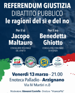 È in programma ad Arzignano venerdì 13 marzo 2026, alle 21, un dibattito pubblico tra le ragioni del Sì e quelle del No al Referendum Costituzionale sulla Giustizia.