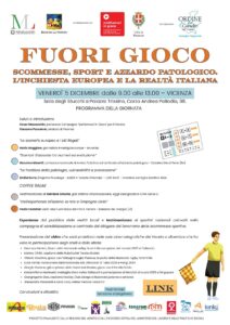 È in programma venerdì 5 dicembre, dalle 9 alle 13, in sala Stucchi a Palazzo Trissino, il seminario “Fuori gioco: scommesse, sport e gioco d’azzardo patologico”. Dopo i saluti del sindaco di Vicenza Giacomo Possamai e di Oscar Mazzocchin, portavoce della campagna “Mettiamoci in gioco” per il Veneto, seguiranno diversi interventi che affronteranno la questione sia dal punto di vista dei numeri e dei risvolti criminosi del gioco d’azzardo, sia considerandone gli aspetti patologici.