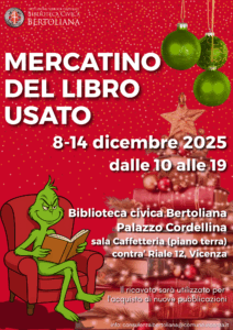Dall’8 al 14 dicembre prossimi la Biblioteca Bertoliana ripropone il Mercatino del libro usato, quest’anno in versione natalizia con una selezione di quasi 800 opere,Il mercatino si terrà nella sala Caffetteria al piano terra di Palazzo Cordellina, in contra’ Riale 12. La collezione proposta spazia tra diverse categorie: narrativa con quasi 90 titoli, poesia con circa 65 volumi, e una ricca sezione dedicata a Vicenza con 185 opere.