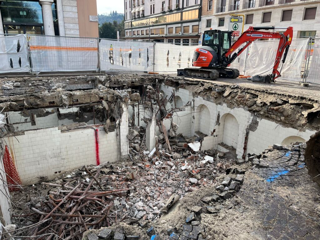 C’era anche l’assessore ai lavori pubblici del Comune di Vicenza Cristiano Spiller in piazzale de Gasperi, dove questa mattina sono iniziati i lavori di demolizione degli ex bagni pubblici, intervento che fa parte del progetto di riqualificazione di viale Roma. Un intervento, ha spiegato l’assessore, che riguarda una struttura che per almeno vent’anni è stata importante per la cittadinanza: «I bagni diurni – ha ricordato Spiller – furono realizzati tra viale Roma e piazzale De Gasperi negli anni Trenta e furono molto utilizzati dai cittadini, anche perché allora nelle abitazioni non sempre erano presenti i servizi igienici. Infatti in questo spazio non c’erano solo le toilette, ma c’erano anche vasche da bagno, docce, il locale parrucchiere e barbiere.» Non solo, negli anni della Seconda guerra mondiale i bagni furono utilizzati anche come ricovero antiaereo. Successivamente però, man mano che nelle abitazioni le dotazioni dei servizi igienici sono andate migliorando, sono andati in disuso e negli anni Cinquanta sono stati chiusi. «Sono dunque più di 70 anni dunque – ha concluso Spiller – che questi locali sono interdetti e in questo lungo tempo le strutture sono andate ad ammalorarsi in modo significativo. Il solaio che divideva i locali dalla piazza, ad esempio, era ormai compromesso ed era quindi necessario e urgente intervenire per mettere in sicurezza l’area».