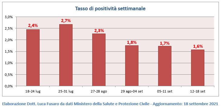 Il tasso di positività, calcolato sui tamponi, scende dall’1,7% all’1,6%.