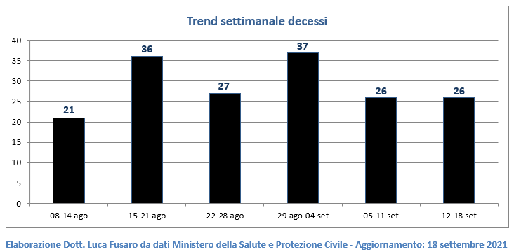 Il numero di decessi rimane stabile a 26. Nel bollettino nazionale del 15 settembre la regione Lazio segnala che dei 6 decessi comunicati in data odierna, 3 si riferiscono al mese di agosto 2021, quindi sono esclusi dal totale settimanale.
