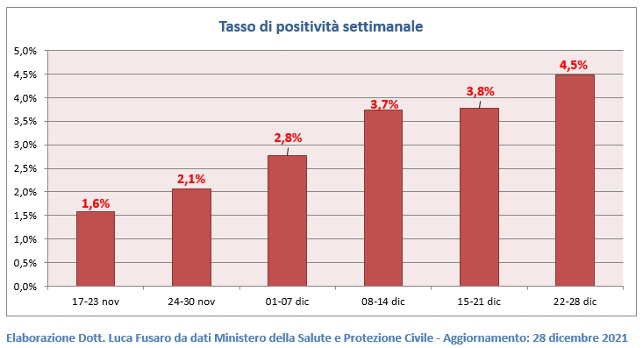L’aumento dei casi settimanali da 27.115 a 32.333 (+19,2%) non dipende dalla lieve crescita dell’attività di testing (+0,7% di tamponi) ma dall’incremento della circolazione del virus infatti il tasso di positività passa da 3,8% a 4,5%.