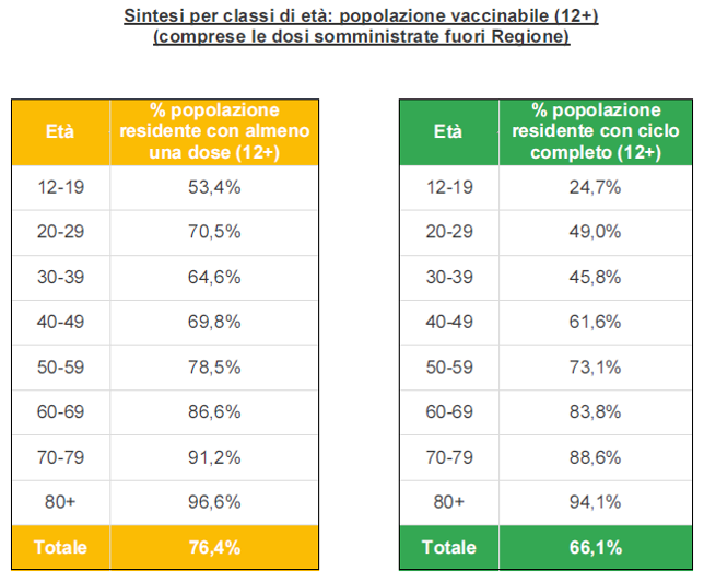 Gli over 60 che hanno completato il ciclo vaccinale sono così suddivisi: 83,8% della fascia 60-69, 88,6% della fascia 70-79, 94,1% degli over 80. Con almeno una dose il 53,4% della classe 12-19, il 70,5% della classe 20-29, il 64,6% della classe 30-39, il 69,8% della classe 40-49, il 78,5% della classe 50-59.