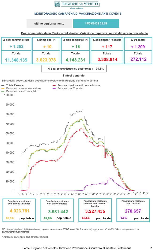 Nella giornata di ieri (qui i dettagli completi del Report Vaccinazioni Covid Veneto al 15 settembre 2022 alle 23.59) sono state effettuate 1.352 (ieri 1231) nuove vaccinazioni anti-Covid di cui 1.209 (ieri 1.074) come quarta dose. Di seguito i dati sulle vaccinazioni in Veneto.
