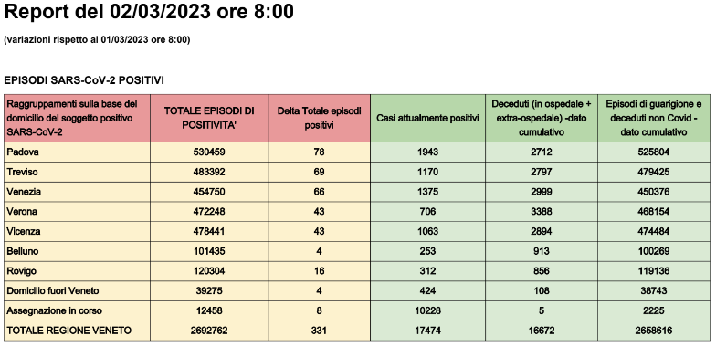 Dati casi Covid per provincia in Veneto al 2 marzo ore 8