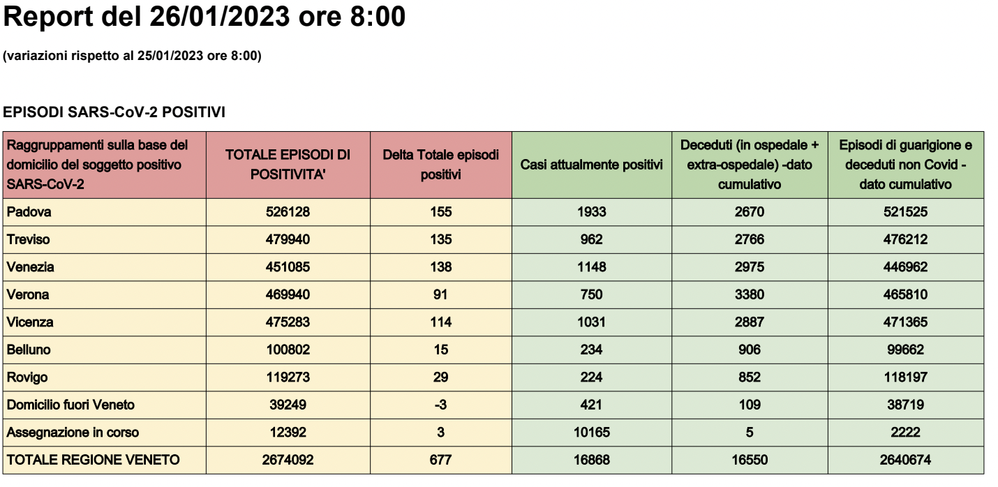 Dati casi Covid per provincia in Veneto al 26 gennaio ore 8