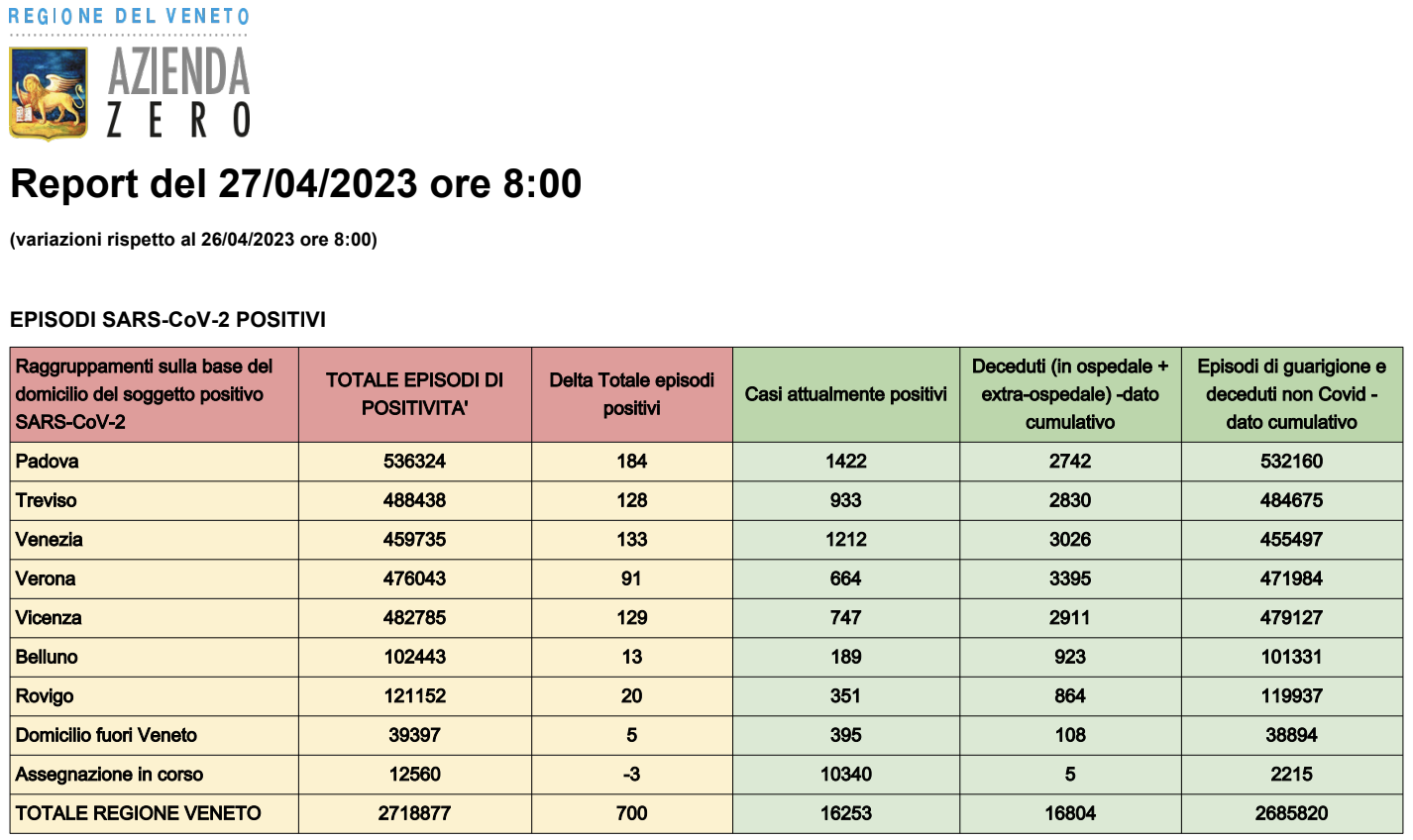 Questi dati sono relativi al raffronto con quelli del giorno precedente, mercoledì 26 aprile 2023, comunicati dalla struttura regionale del Veneto, Azienda Zero.