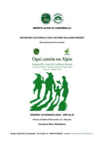Appuntamento con la cultura, la storia e la tradizione alpina quello di venerdì prossimo 30 gennaio in quel di Campedello, frazione di Vicenza: la sede del locale Gruppo Alpini, in via Ischia 12, ospiterà la presentazione del libro di Galliano Rosset “Ogni cantón un Alpin”, un volume dove lo storico e artista ha raccolto e commentato gli oltre 50 acquerelli a tema alpino, legati soprattutto alla Grande Guerra, già esposti nei locali della Stamperia storica Busato di Vicenza in occasione della 95^ Adunata Nazionale degli Alpini, tenutasi a Vicenza nel maggio del 2024.