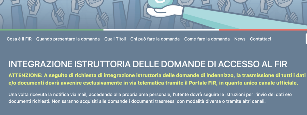 Di seguito pubblichiamo la comunicazione inviata da Consap agli interessati e pervenuta anche a noi, che, pur non essendo soci di alcuna delle Banche, i cui azionisti azzerati sono stati “coperti” dal Fir, avevamo aperto una procedura per poter spiegare ai nostri lettori come seguirla… (cfr. “Portale Consap: un video su come compilare le istanze per indennizzi Fir, i problemi. E un memo per Lanzarin…“).