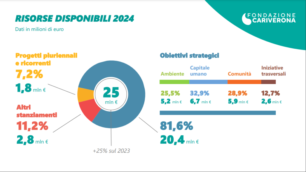 Migliorare il presente per costruire un nuovo futuro, fondato sulla difesa dell’ambiente, sulla valorizzazione dei giovani e sulla creazione di comunità coese e inclusive. Sono questi i cardini attorno ai quali ruota la visione di Fondazione Cariverona contenuta nel documento di programmazione annuale, approvato venerdì 27 ottobre dal Consiglio generale. Le risorse a disposizione per il 2024 – pari a circa 25 milioni di euro, con un incremento del 25% rispetto al 2023 – sosterranno lo sviluppo dei territori di Verona, Vicenza, Belluno, Ancona e Mantova attraverso una serie di bandi e iniziative dirette.