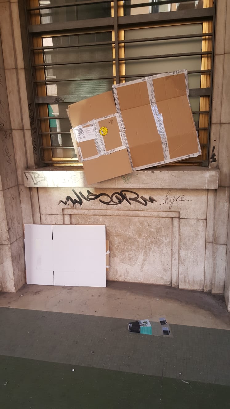 Il lettore di ieri ci invia altre foto della ‘dimora’ di un senzatetto in piazza Garibaldi dietro al container delle Poste. Del resto il palazzo è abbandonato da tempo immemore per lavori di ristrutturazione. Gli utenti stanno fuori e anche gli invisibili stanno fuori, con giacigli di fortuna che Aim non rimuove, quasi riconoscesse che lì ci vive qualcuno. “In una location di pregio, non manca il Vespasiano!” scrive il nostro lettore indicando i segni di un bisogno fisiologico espletato. E poi basta fare due passi più avanti e dietro all’enorme edificio in decadenza delle Poste e dirimpetto allo storico locale “Al Campanile” troviamo un ragazzo che dorme sugli scalini, alle 10:30 del mattino. Lui è pakistano, alcuni dicono sia un tossico, lo trovate spesso alla sera in Contra’ Barche che vi chiede qualche soldo. Da veneti potreste avere piuttosto l’idea di offrirgli un’ombra, ma lui rifiuterà.