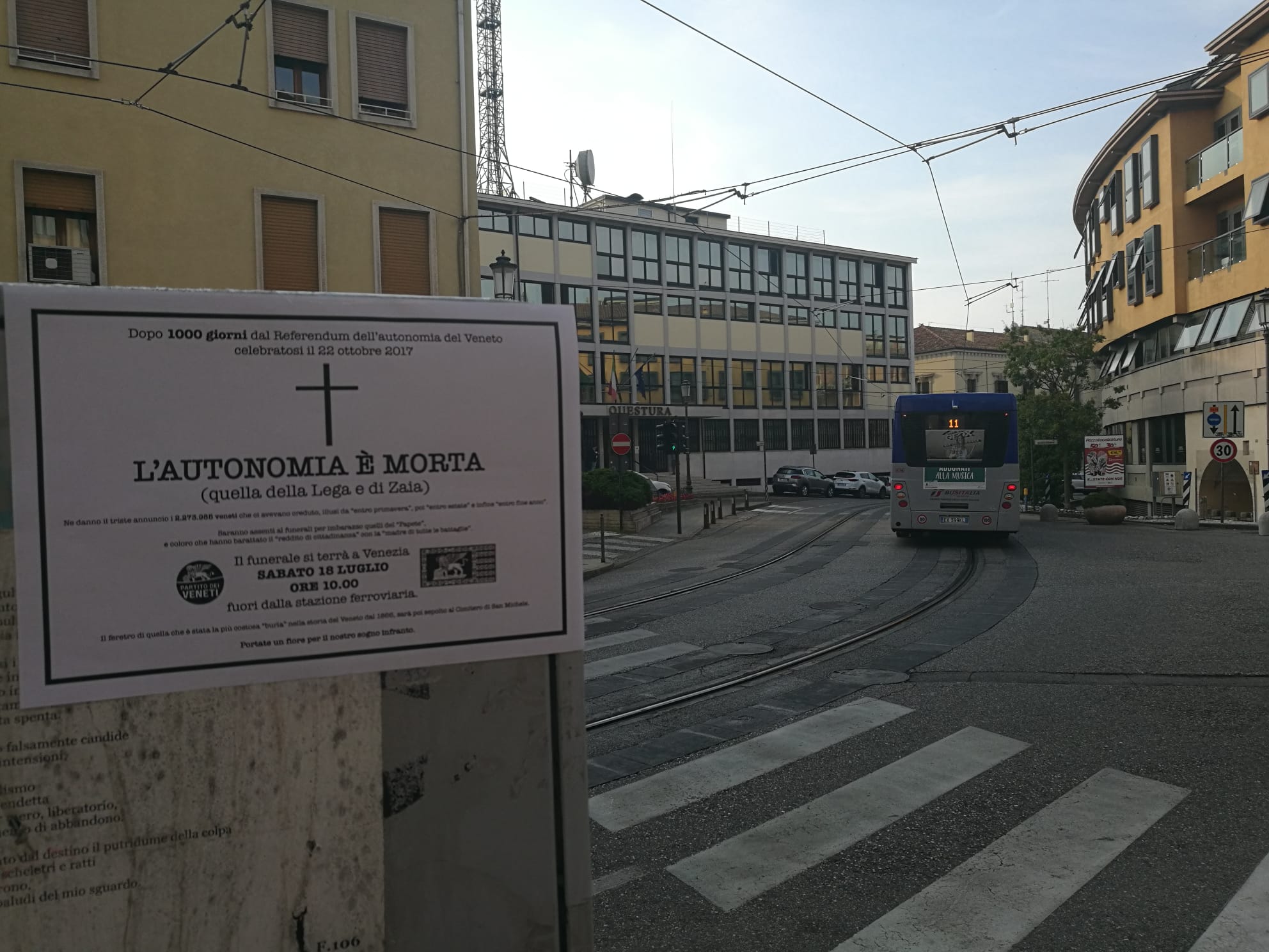 Sabato 18 luglio alle 10 verranno riunite dieci sigle dell’autonomismo e dell’indipendentismo veneto, davanti alla stazione di Venezia Santa Lucia. Il presidio degli autonomisti veneti si concluderà con la deposizione della bara con dentro la finta autonomia su una barca, che porterà il simbolico feretro al camposanto veneziano.
