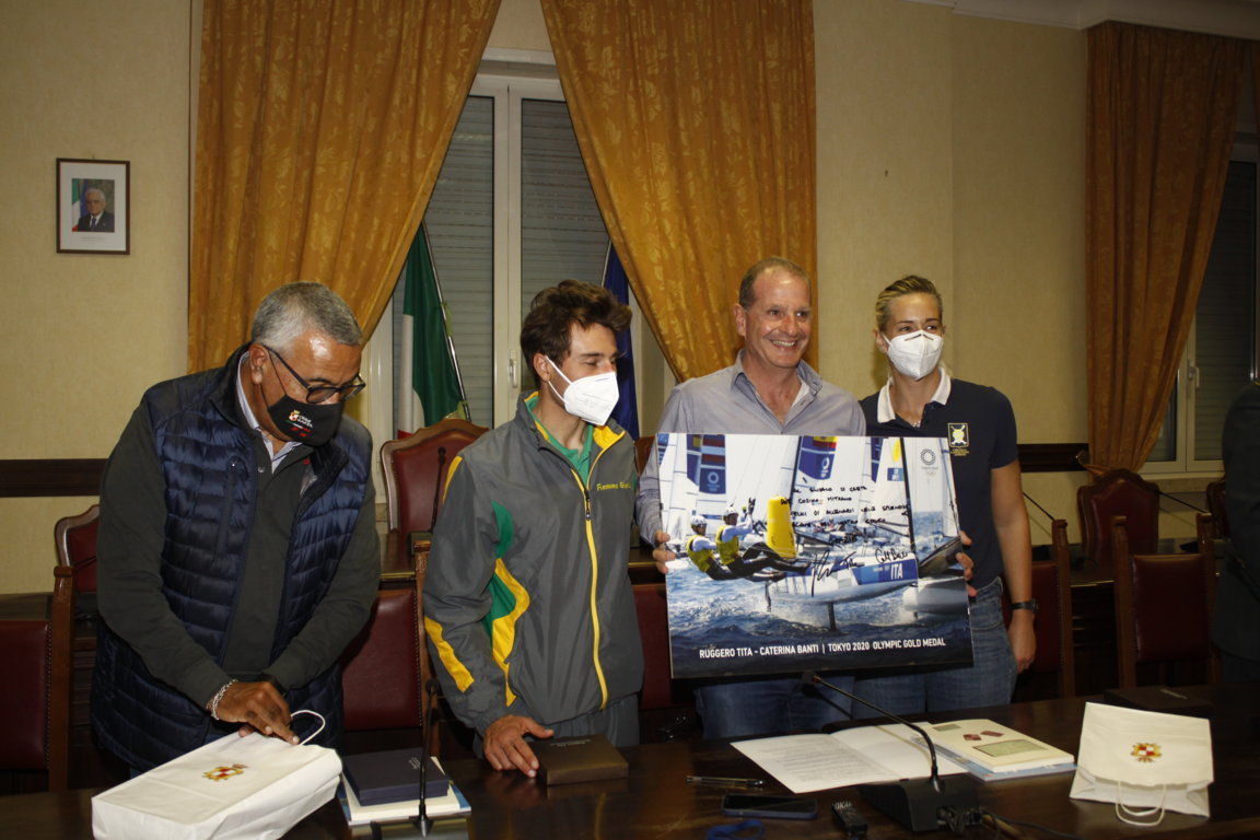 Nella mattinata del 5 novembre al Comune di Gaeta il sindaco Cosmo Mitrano ha ricevuto in modo formale i due campioni olimpici di Tokyo 2020, Caterina Banti e Ruggero Tita, che hanno composto il team misto che nella specialità velica del Nacra 17 hanno conquistato la medaglia d’oro olimpica. Sono stati accompagnati dal settore tecnico del IV Nucleo Atleti della Fiamme Gialle che ha sede a Gaeta, comandato attualmente dal tenente Francesco Nerone.