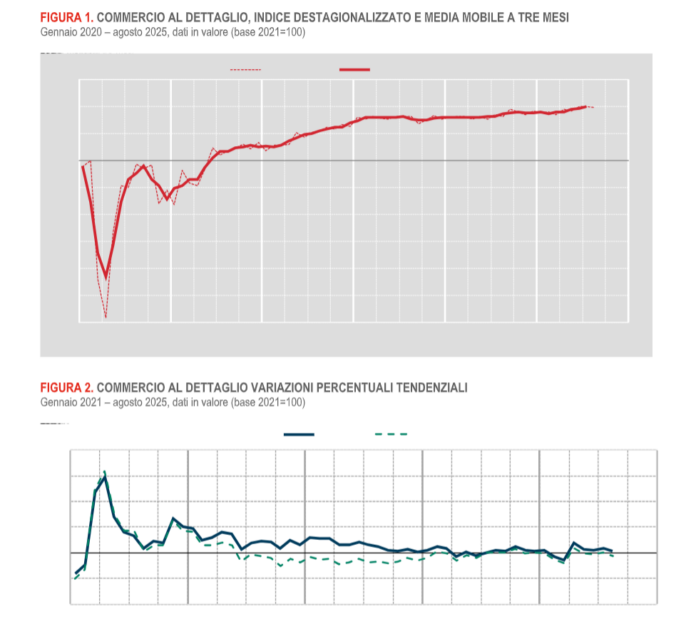 Su base tendenziale, ad agosto 2025, le vendite al dettaglio registrano una variazione positiva dello 0,5% in valore e una diminuzione dell’1,3% in volume. Le vendite dei beni alimentari aumentano in valore (+1,6%) e calano in volume (-2,2%), mentre quelle dei beni non alimentari sono in diminuzione sia in valore sia in volume (rispettivamente -0,2% e -0,6%).
