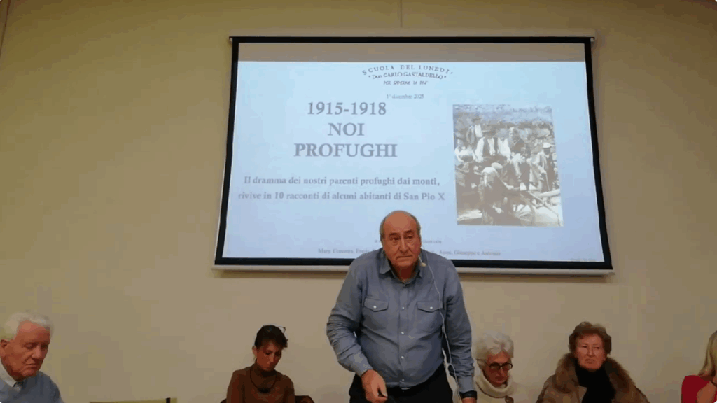 1915-18 la tragedia dei profughi dai nostri monti è il tema che ha inaugurato il mese di dicembre nel calendario di appuntamenti della “Scuola del lunedì”, presso la sala della biblioteca La Locomotiva, il cui palazzo in via Rismondo 2 ai Ferrovieri è occupato da lavori di manutenzione. La pioggia non ha fermato i moltissimi interessati che, come sempre, hanno riempito la sala (poche le sedie libere e tutte in fondo).