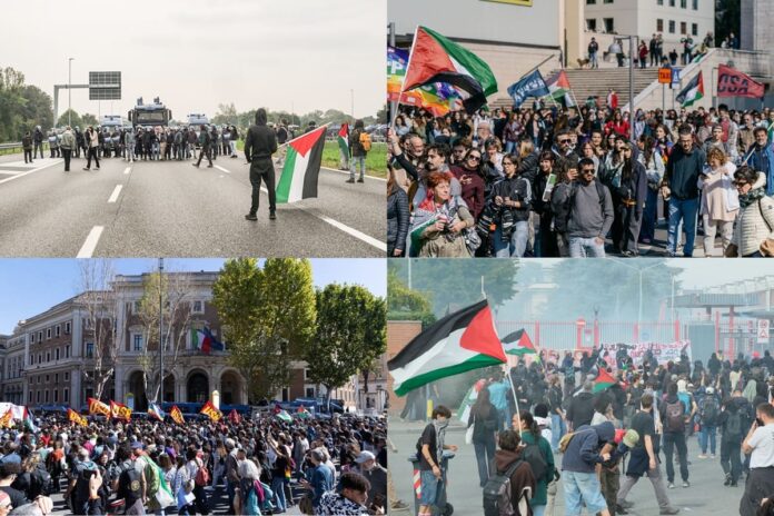 ROMA (ITALPRESS) – Proteste, cortei e manifestazioni oggi in tutta Italia in occasione dello sciopero generale indetto contro l’abbordaggio israeliano della Global Sumud Flotilla, diretta a Gaza per portare aiuti alla popolazione. Oltre 100 le manifestazioni organizzate in tutta Italia nella giornata di mobilitazione. Lo sciopero ha riguardato servizi pubblici e privati, sanità, scuola e trasporti.