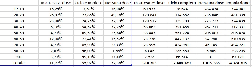 Nota metodologica: nel calcolo delle percentuali dei vaccinati utilizzo come dato non l’intera popolazione regionale ma la platea interessata ossia i soggetti ? 12 anni che secondo la stima dell’Istat sulla popolazione residente al 1° gennaio 2021 è pari a 4.374.306.