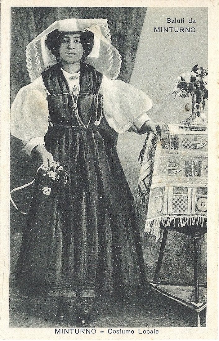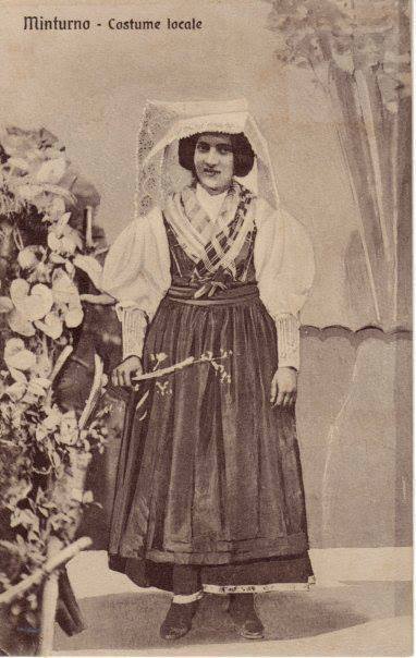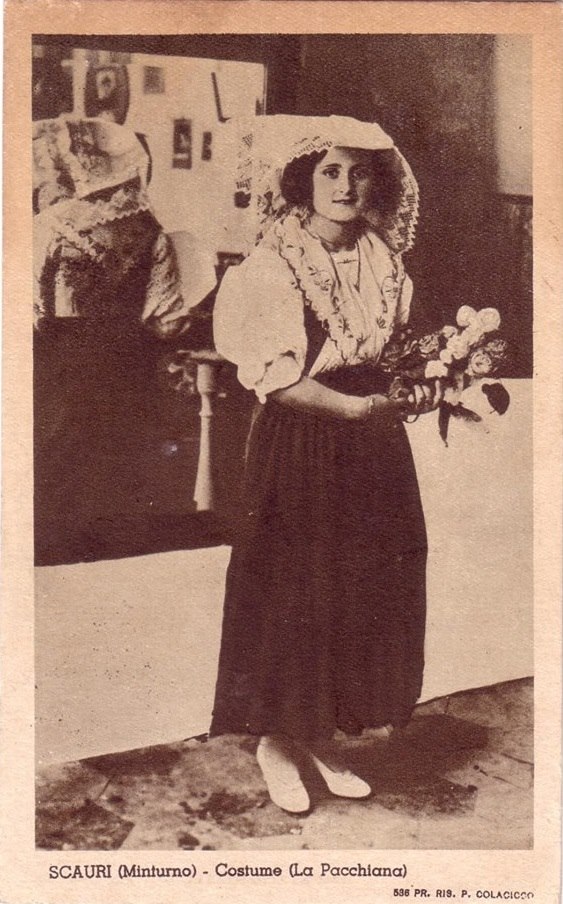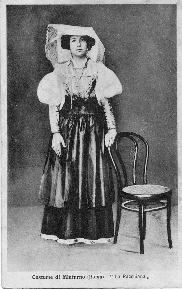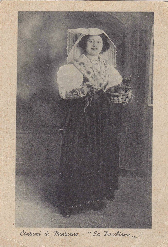 La donna minturnese, modestissima, si copre da capo a piedi, ma il suo costume risponde anche a motivi di bellezza e di gusto, da renderla assai leggiadra. D’una bellezza fisica tipicamente mediterranea, robusta e fiorente, ma allo stesso tempo dai lineamenti fini, la Pacchiana impressiona subito per una specie di “tovaglia” inamidata che porta sul capo, fissata con uno spillo alle attorte trecce del capo, di bianca mussola, orlata a merletto o “pizzo” e ricadente dietro la nuca.