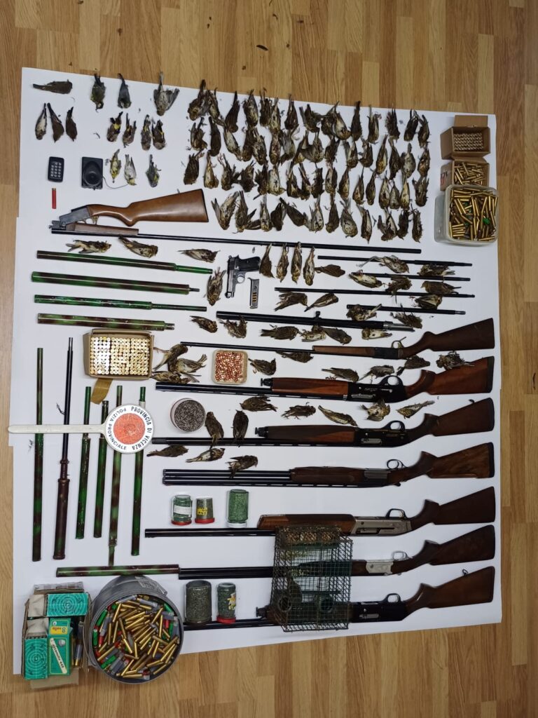 Gli agenti hanno raggiunto il bracconiere, rinvenendo subito il telecomando per il richiamo acustico elettromagnetico. Successivamente hanno perquisito l’abitazione dell’uomo che ha portato al sequestro di 8 fucili, 11 silenziatori artigianali, migliaia di munizioni di vario calibro, inneschi e polvere da sparo, gabbie a scatto e gabbie con richiami vivi. Un fucile risultava alterato per l’installazione di un silenziatore artigianale e si trovava incustodito all’interno di un annesso con la porta aperta, con una cartuccia inserita nella canna in cui era installato il silenziatore. Nello stesso annesso, malamente custodite, c’erano munizioni e polvere da sparo.