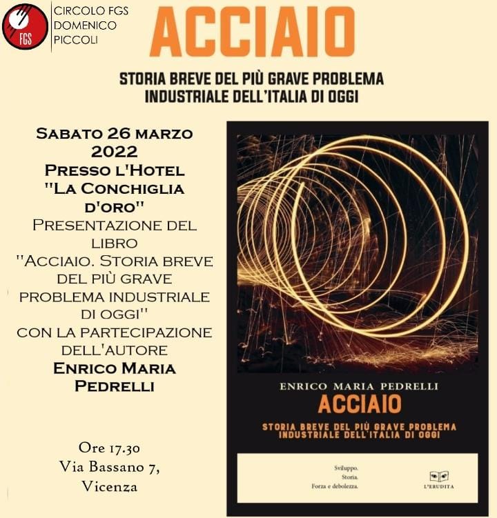 Il Circolo “Domenico Piccoli” dei Giovani Socialisti di Vicenza e Padova è lieto di annunciare che in data 26 Marzo, alle ore 17.30, presso la sala convegni dell’hotel “Conchiglia d’Oro” di Vicenza si terrà la presentazione del libro “Acciaio – Storia breve del più grande problema industriale dell’Italia di oggi”, di Enrico Maria Pedrelli, segretario nazionale dell’FGS.