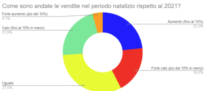 Il mese dello shopping si è appena concluso. Dicembre 2022 è stato contrassegnato da un Natale sottotono rispetto al 2021, a rivelarcelo le risposte dei commercianti padovani e vi centini che registrano un calo o forte calo delle vendite per il 41,1% dei casi. Il 31,5% non ha rilevato particolari cambiamenti e dichiara invariata la portata delle vendite rispetto all’anno scorso. Il 27,3% degli esercenti ha chiuso meglio il 2022, infatti asserisce di aver riscontrato un aumento o forte aumento delle vendite.