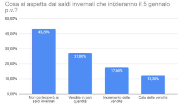 In merito alle aspettative sui saldi di gennaio e febbraio 2023, solo il 17,6% degli intervistati si aspetta un impatto positivo sulla propria attività commerciale. Il 27% non prevede alcuna variazione. Il 12,2% addirittura un calo. Molti gli astensionisti: il 43,2% dei rispondenti ha deciso di non prendere parte attiva alle iniziative promozionali bimensili alle porte.