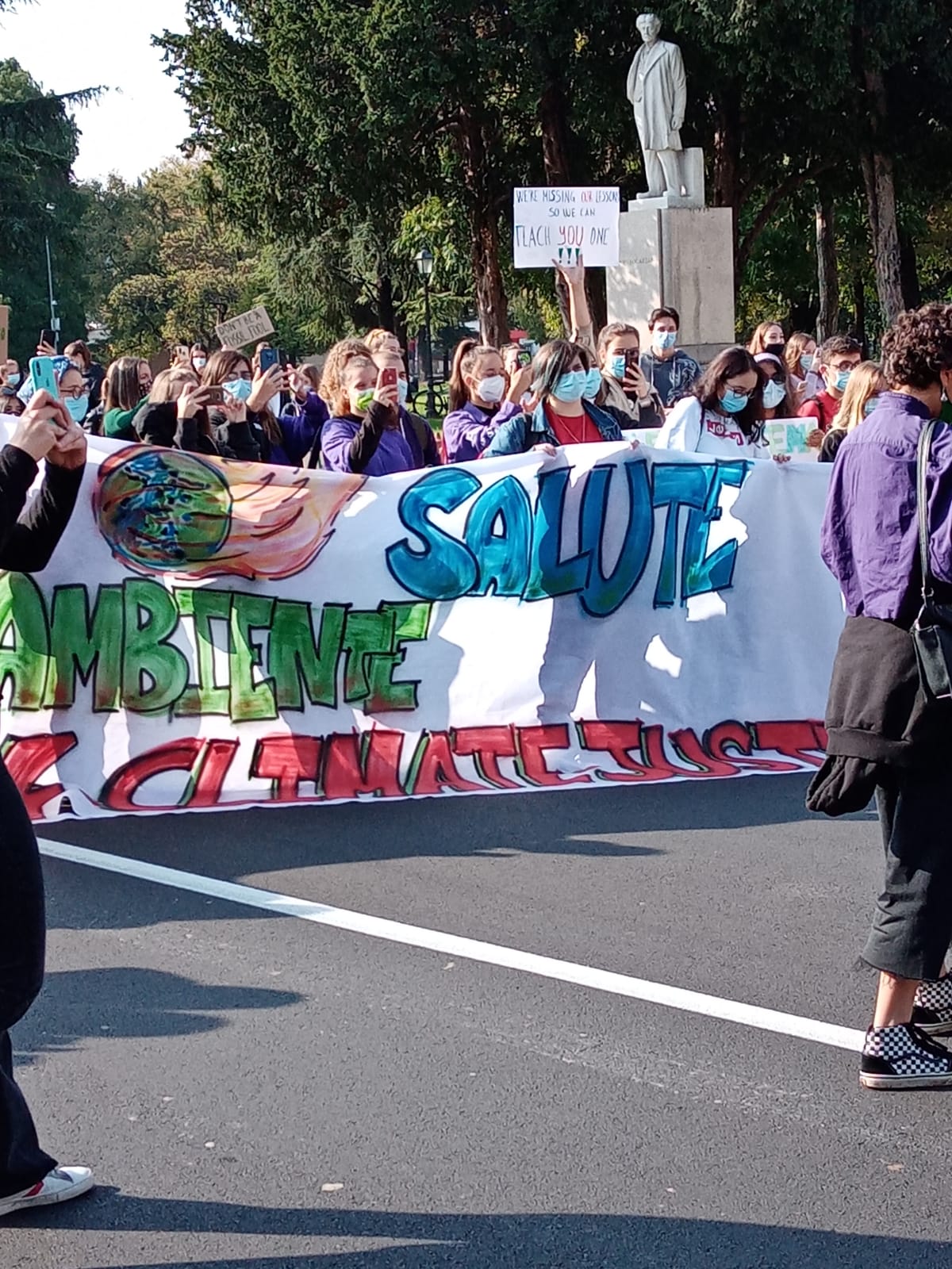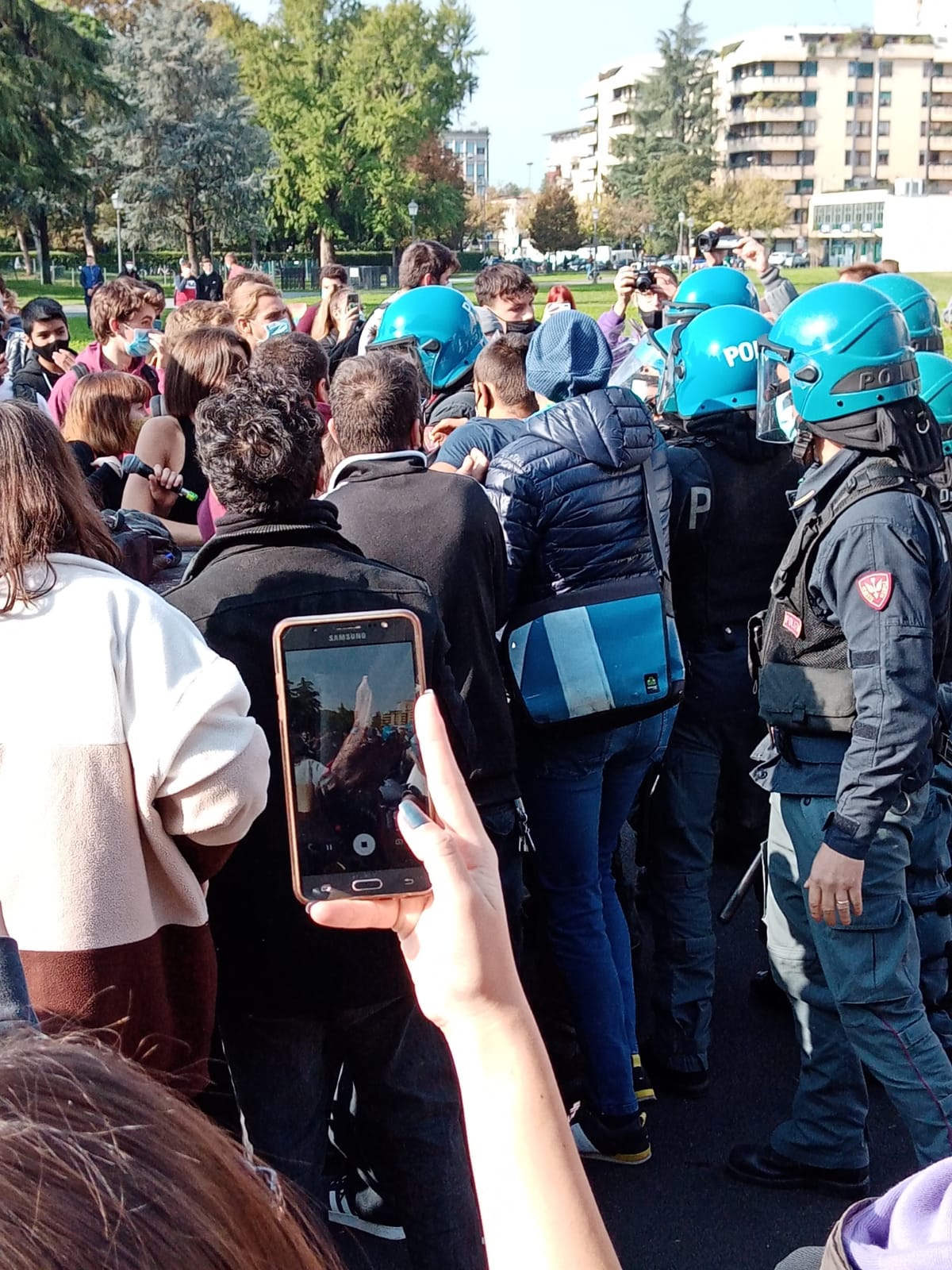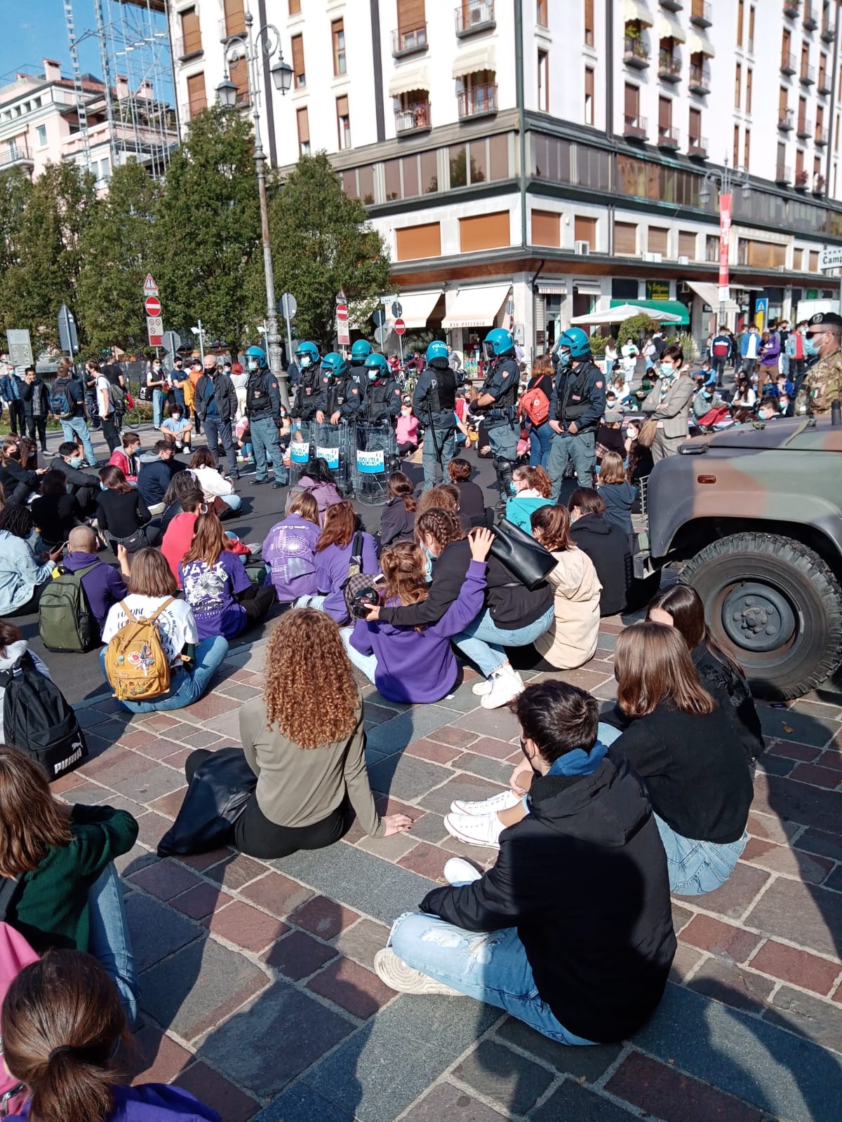 Dopo un primo momento di tensione, gli studenti si sono fermati bloccando la strada, si sono seduti, hanno predicato di mantenere le distanze per non creare assembramenti, e hanno continuato a urlare la loro rabbia giovane contro le multinazionali