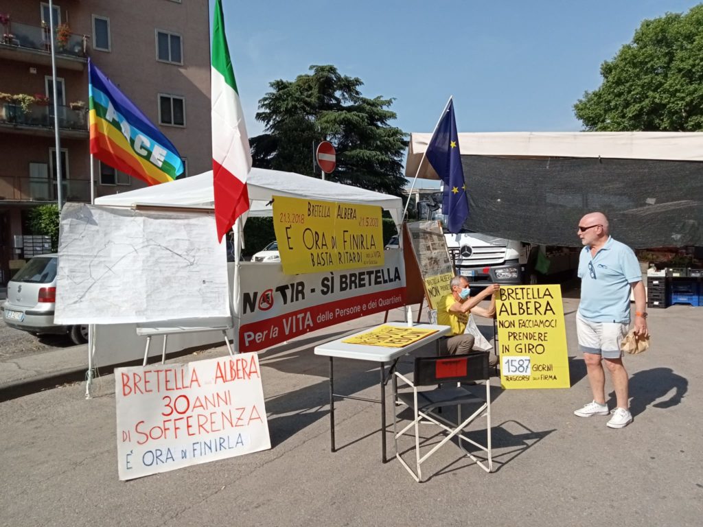 Il Comitato dell’Albera “No Tir Sì Bretella per la Vita” ha allestito per oggi dalle ore 8 (vedi foto), sabato 21 maggio, un gazebo, al mercato Villaggio del Sole Villaggio della Produttività via Brg Granatieri di Sardegna, per fornire informazioni sullo stato dell’arte e per la sollecitazione dei lavori