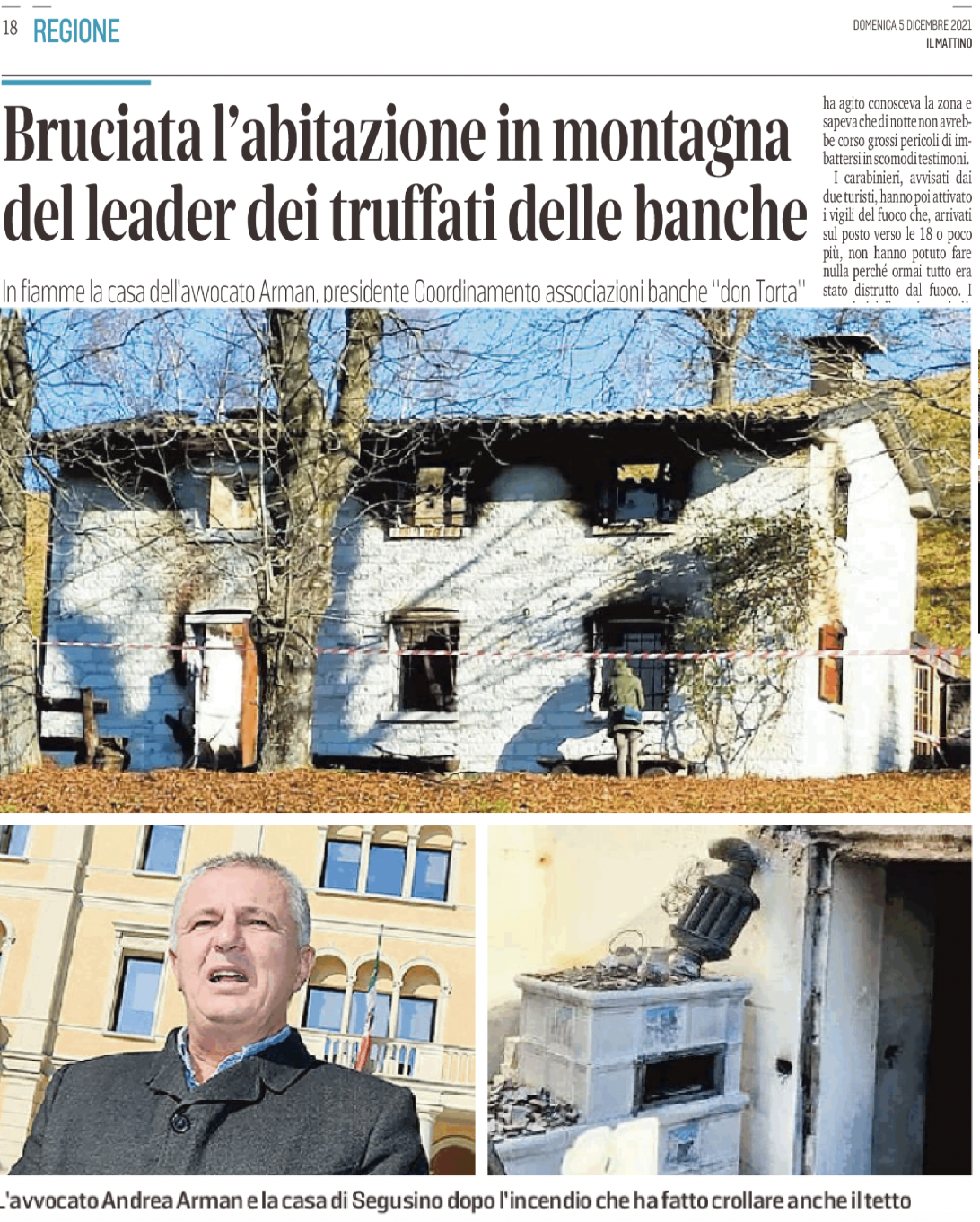 Col titolo "In fiamme la casa dell'avvocato Arman, presidente Coordinamento associazioni banche "don Torta". Bruciata l'abitazione in montagna del leader dei truffati delle banche" Il Mattino di Padova, per una inimmaginabile coincidenza nella stessa pagina con la recensione del libro "Banca Popolare di Vicenza. La cronaca del processo" del prof. Rodolfo Bettiol e a mia cura, dà conto di quello che, da quanto scrive il collega Marco Filippi in base ai primi rilievi degli inquirenti, sembrerebbe un incendio doloso.